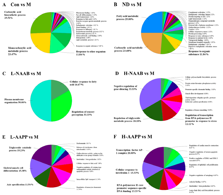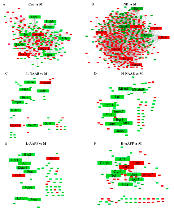 對(duì)不同分組中的DEGs進(jìn)行ClueGO分析,以生成按功能分組的注釋網(wǎng)絡(luò)圖(圖4A?F)。在CON/M差異分組的結(jié)果中,DEGs主要富集在羧酸生物合成過(guò)程、單羧酸代謝過(guò)程和對(duì)其他有機(jī)物的反應(yīng)過(guò)程。在ND/M分組差異結(jié)果中,脂肪酸代謝過(guò)程、羧酸代謝過(guò)程和對(duì)有機(jī)物的反應(yīng)過(guò)程是富集排名前3的功能分組。在ND/M和CON/M分組中,DEGs主要在單羧酸代謝過(guò)程、羧酸生物合成過(guò)程、脂肪酸代謝過(guò)程、脂肪代謝過(guò)程和對(duì)有機(jī)物的反應(yīng)過(guò)程相關(guān)的通路中富集。在L-NAAB/M分組差異結(jié)果中,DEGs組要與三個(gè)功能通過(guò)有關(guān):質(zhì)膜組織、感覺調(diào)節(jié)和細(xì)胞對(duì)脂肪酸的反應(yīng)。在H-NAAB/M差異結(jié)果中,DEGs主要富集于基因沉默的負(fù)調(diào)控、甘油三酯代謝過(guò)程的調(diào)控以及RNA聚合酶II啟動(dòng)子對(duì)脅迫反應(yīng)的轉(zhuǎn)錄調(diào)控。在L-AAPP/M比較中,DEGs在甘油三酯分解代謝過(guò)程、骨骼肌細(xì)胞分化和軸規(guī)范方面都明顯富集。在H-AAPP/M差異結(jié)果中,發(fā)現(xiàn)轉(zhuǎn)錄因子AP-1復(fù)合體、細(xì)胞對(duì)白細(xì)胞介素-1的反應(yīng)以及RNA聚合酶II核心啟動(dòng)子序列特異性DNA結(jié)合等通路顯著富集。