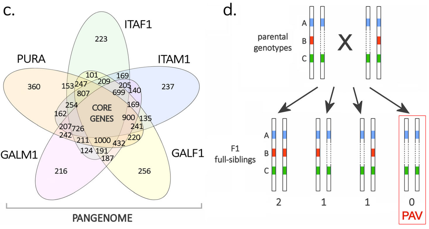 ② 地中海貽貝具有極強(qiáng)的環(huán)境適應(yīng)性,是歐洲和中國重要的海產(chǎn)品。作者基于Illumina及PacBio等技術(shù)構(gòu)建了1.28G地中海貽貝基因組,并對來自兩個獨立群體的14個個體進(jìn)行了重新測序后,揭示了地中海貽貝的復(fù)雜泛基因組結(jié)構(gòu)。研究發(fā)現(xiàn),非核心基因與受結(jié)構(gòu)變異影響的半合子基因組區(qū)域相關(guān),這些區(qū)域總共占了參考基因組組裝中未包含的近580 Mb DNA序列。富集分析表明,非核心基因顯著富集在與環(huán)境適應(yīng)性相關(guān)的通路中(如細(xì)胞凋亡、免疫信號傳導(dǎo)等)。PAV也顯著影響地中海貽貝中編碼抗菌肽(AMPs)的基因家族,表明非核心基因組增強(qiáng)了地中海貽貝的環(huán)境適應(yīng)性。這是報道在動物界廣泛存在基因存在缺失變異的研究( Gerdol M et al., Genome Biology. 2020)。