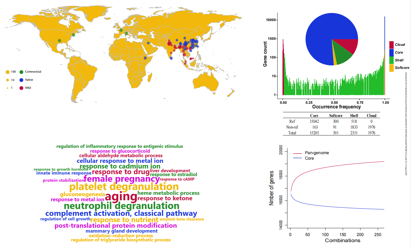 - 對于一些農(nóng)業(yè)畜牧養(yǎng)殖相關(guān)的動物,往往由于人工的干預(yù)或是自然環(huán)境的選擇,在同一個種內(nèi)水平下會有非常多的品系/亞種/變種。這些馴化前后的群體間表型和基因型的巨大差異可能隱藏在每個品系基因組種,因此能體現(xiàn)這些動物品系內(nèi)的共性又能體現(xiàn)不同品種間差異的泛基因組就顯得尤為重要。