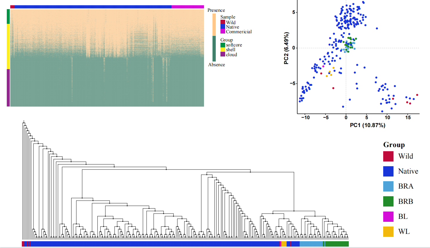 通常泛基因組研究除了構(gòu)建pan-genome,會進(jìn)行核心基因(core gene)、非核心基因(dispensable gene)以及特有基因(Private)來研究物種相關(guān)農(nóng)藝性狀與功能基因。而結(jié)構(gòu)變異是泛基因組的重點研究對象,通過PAV(存在與缺失變異)、倒位、易位、拷貝數(shù)變異等結(jié)構(gòu)變異信息尋找引起不同品系間差異性狀的關(guān)鍵變異位點。除此之外,泛基因組還可以結(jié)合三維表觀調(diào)控、群體遺傳進(jìn)化、全基因組關(guān)聯(lián)分析、轉(zhuǎn)錄共表達(dá)、差異代謝物以及數(shù)據(jù)庫構(gòu)建存儲等方式進(jìn)行深入的數(shù)據(jù)挖掘。