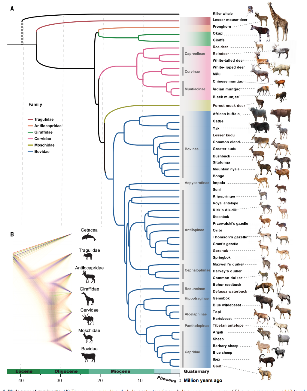 同樣這樣大規(guī)模不同科屬研究的還有2020年Nature封面文章,通過6種蝙蝠基因組揭示演化和潛在功能,探索蝙蝠有別于其他哺乳動物的免疫調(diào)節(jié)機(jī)制。以及2020年發(fā)表在Science上的反芻動物基因組,該研究共進(jìn)行了6個科的44個反芻動物De novo組裝,結(jié)合化石信息,構(gòu)建了所有節(jié)點100%支持的全基因組系統(tǒng)發(fā)育樹,高置信度的進(jìn)化樹進(jìn)一步確認(rèn)了叉角羚科與長頸鹿科的姐妹類群關(guān)系,以及麝科與牛科姐妹類群關(guān)系等一直以來備受爭議的分類問題。并對反芻動物基因組結(jié)構(gòu)特征及演化進(jìn)行研究,進(jìn)而對反芻動物中的“消化系統(tǒng)”“多腔胃演化”“角形態(tài)”“體型”等特征進(jìn)行解析。該研究基于大量的基因組數(shù)據(jù),將反芻動物基因功能與動物的適應(yīng)性性狀聯(lián)系起來,為動物譜系基因組打開了一個新的研究篇章。