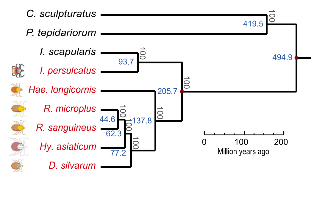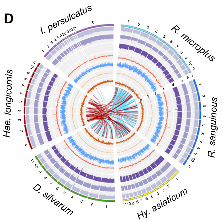 除了上述跨越科水平的譜系基因組研究,其實還有很多同科內(nèi)不同屬間的動物群體基因組。例如通過構(gòu)建硬蜱科內(nèi)6種蜱蟲基因組,解析不同蜱種的演化歷程,揭示了蜱專性吸血的遺傳機(jī)制以及蜱蟲遺傳多樣性及分布規(guī)律,并通過宏基因組學(xué)研究等方式探究了蜱媒病原體的生態(tài)分布和進(jìn)化機(jī)制(Jia N et al., Cell.2020)。