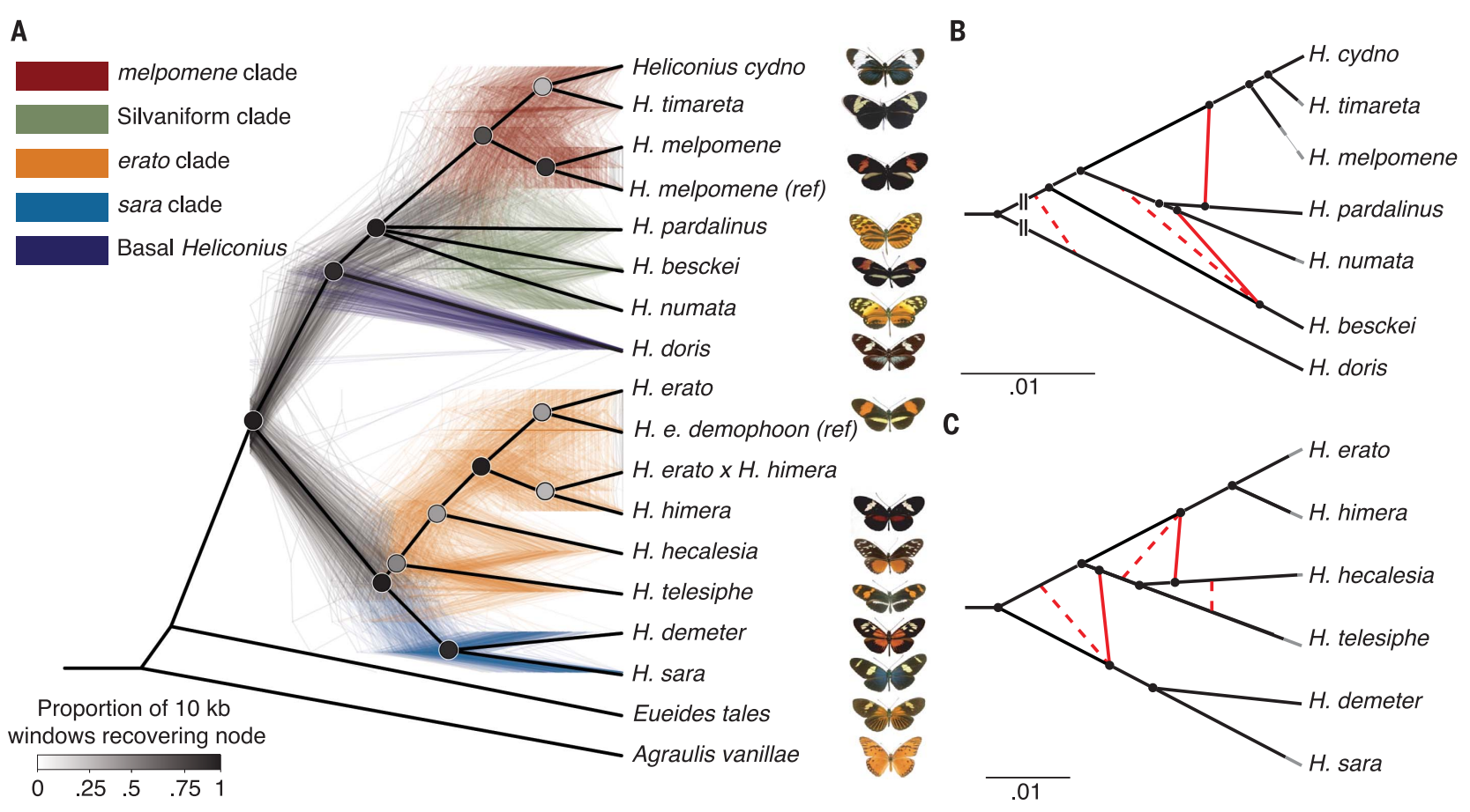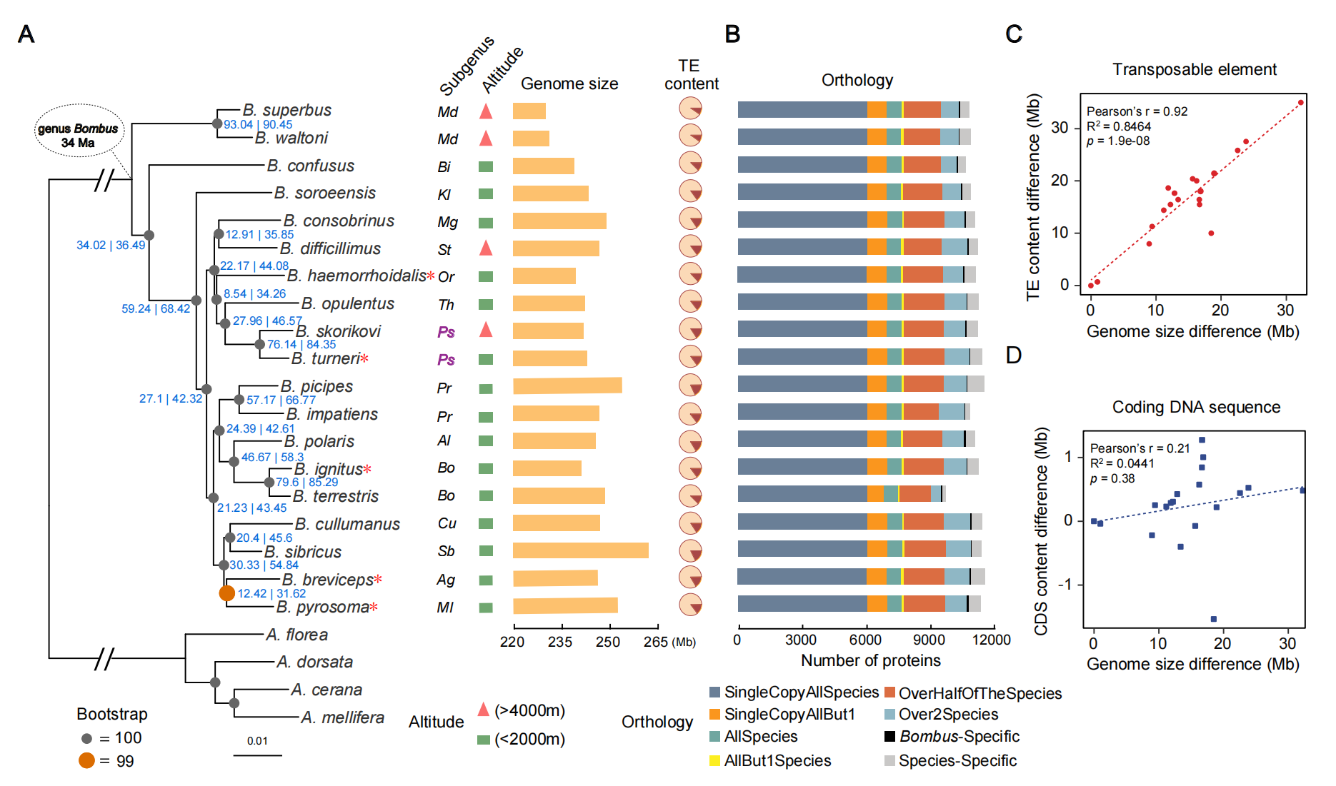 針對于同一個屬內(nèi)不同種之間的研究,由于其間親緣關(guān)系相對較近,基因組間相似度較高,往往是對其基因結(jié)構(gòu)特征差異、轉(zhuǎn)座子分析、屬內(nèi)分類研究、基因組間的基因漸滲現(xiàn)象、大型結(jié)構(gòu)變異挖掘、基因正選擇分析上進(jìn)行。例如,作者通過構(gòu)建20個新的袖蝶屬基因組揭示基因滲入和不完全譜系分選的作用(Edelman N B et al.,Science.2020)、通過15個亞屬的17種熊蜂基因組確定了關(guān)鍵生態(tài)和取食偏好等行為特征相關(guān)的變異(Sun C et al.,Mol Biol Evol.2020)。