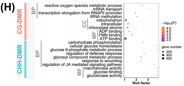 通過WGBS測序技術(shù)在10份野生大麥材料中共獲得1620Gb的cleandata,共鑒定出131408470個CG甲基化位點(diǎn)(mCG)(占所有CGs的94.7%)、 97714324個mCHGs位點(diǎn)(占所有CHGs的77.6%)和20576899個mCHHs位點(diǎn)(占所有CHHs的2.9%)。并且一共鑒定出121433個差異甲基化區(qū)域(DMRs),其中52306個CG-DMRs,30720個CHG-DMRs和38407個CHH-DMRs(圖C)。通過甲基化區(qū)域在染色體上的分布,作者發(fā)現(xiàn)CG-DMRs和CHH-DMRs兩種類型的差異甲基化區(qū)域在染色體的遠(yuǎn)端區(qū)域高度積累,并且主要集中在基因區(qū)和啟動子區(qū),而CHG-DMRs的情況則和它們不同,不僅在染色體上分布相對均勻,并且基因區(qū)和啟動子區(qū)的表達(dá)也相對比較低(圖A)。這些結(jié)果表明,CG-DMRs和CHH-DMRs可能在野生大麥兩個土壤種群的適應(yīng)性功能多樣化和基因區(qū)域調(diào)控中發(fā)揮重要作用。對CG-DMR基因和CHH-DMR基因進(jìn)行GO富集分析,發(fā)現(xiàn)CG-DMR主要富集在與基本過程相關(guān)的基因中,如ATP的產(chǎn)生、轉(zhuǎn)錄和翻譯,而CHH-DMR基因在代謝過程中富集,包括碳代謝、糖代謝和應(yīng)激反應(yīng)途徑(圖H)。