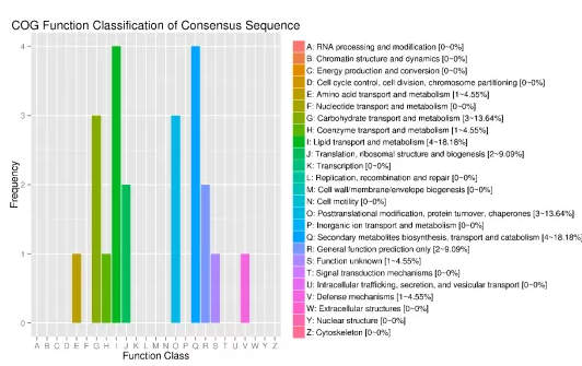 在COG富集分析中橫軸代表功能分類(lèi),縱軸代表基因頻數(shù)。