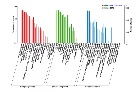 在GO富集分析中橫軸代表GO term,左側(cè)縱軸代表基因占比,右側(cè)為基因的數(shù)目。