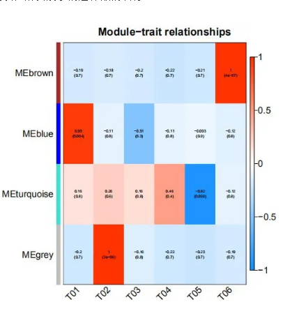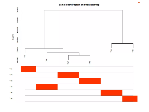 在基因表達(dá)量的樣本系統(tǒng)聚類(lèi)樹(shù)的基礎(chǔ)上我們添加了熱圖,樣本與性狀之間的相關(guān)性越高熱圖中模塊顏色也會(huì)越深。例如我們將熱圖左邊的T01看作是性狀標(biāo)簽,它與分支樣本TP01的熱圖模塊呈現(xiàn)紅色,說(shuō)明性狀T01與樣本T01的相關(guān)性非常高。