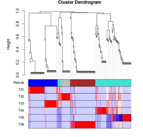 基因的系統(tǒng)樹(shù)圖及性狀相關(guān)性熱圖主要分為三個(gè)部分:第一個(gè)部分為基因聚類(lèi)繪制的聚類(lèi)樹(shù),分枝代表基因;第二部分為基因聚類(lèi)樹(shù)根據(jù)不同的聚類(lèi)對(duì)應(yīng)到的不同模塊;第三部分為性狀的熱圖,如圖中T01~T06為性狀,對(duì)應(yīng)熱圖中的顏色越深,說(shuō)明該模塊中的基因與該性狀的相關(guān)性越高。