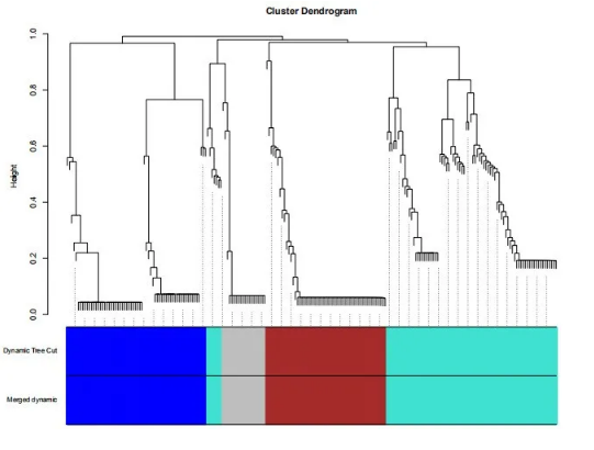 基因網(wǎng)絡(luò)模塊主要分為三個(gè)部分:第一部分為基因的聚類(lèi)樹(shù);第二部分為根據(jù)基因聚類(lèi)樹(shù)劃分的不同模塊;第三部分為根據(jù)第二部分模塊進(jìn)行了矯正,最后結(jié)果為校正后的模塊。