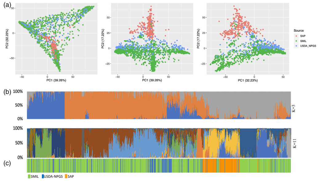 基因庫收集和保存大量植物和詳細的護照信息,目的是保護遺傳多樣性以進行保護和育種。此類集合的遺傳表征有可能闡明重要作物的遺傳歷史,使用標記-性狀關(guān)聯(lián)來鑒定感興趣性狀的位點,尋找正在進行選擇的位點,并通過識別分類錯配和重復為基因庫管理作出貢獻。本研究通過GBS測序?qū)碜匀蚧驇斓?0,038個辣椒 (Capsicum spp.) 種質(zhì)進行基因分型,并調(diào)查了這種標志性主食的近期歷史?;赟NP數(shù)據(jù)計算了identity-by-state (IBS) 比例,在基因庫內(nèi)和基因庫之間檢測到多達 1,618 個重復種質(zhì)。進一步深入分析了常見食用辣椒的遺傳多樣性以調(diào)查其歷史,發(fā)現(xiàn)在全球廣泛地區(qū)收集的辣椒種類有很大的重疊。GWAS分析和選擇清除分析發(fā)現(xiàn)辣椒性狀,如刺激性,這些性狀在全球分布不均勻,表明人類偏好對馴化辣椒的遺傳結(jié)構(gòu)產(chǎn)生了主要影響。