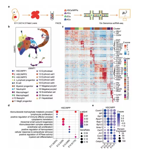 a FL組織的scRNA-seq 實(shí)驗(yàn)流程示意圖。b FL中所有單細(xì)胞的UMAP可視化。c熱圖顯示每個(gè)細(xì)胞簇前20個(gè)DEGs的表達(dá)模式。d在 FL 發(fā)育過(guò)程中,HSC/MPP 中富集的 GO通路。e FL發(fā)育過(guò)程中 HSC/MPP 中富集的 DEGs的散點(diǎn)圖。