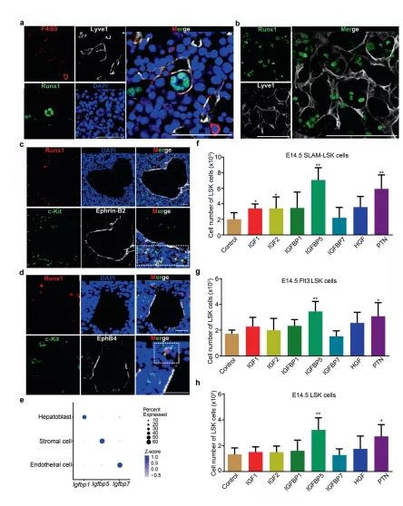 a 免疫熒光分析顯示了在 E14.5 FL 冷凍切片中 Lyve1(代表ECs)和 Runx1(代表 HSCs/MPPs)的表達(dá)。b免疫熒光分析顯示了 E14.5 FL 冷凍切片中 Lyve1(代表EC)和 Runx1(代表 HSCs/MPPs)的表達(dá)。c免疫熒光分析顯示 E14.5 FL 冷凍切片中 c-Kit(代表 HSCs/MPPs)、Runx1(代表 HSCs/MPPs)和 EphrinB2(代表動(dòng)脈門(mén)脈血管)的表達(dá)。d免疫熒光分析顯示 c-Kit(代表 HSCs/MPPs)、Runx1(代表 HSCs/MPPs)和 EphB4(代表靜脈)在 E14.5 FL 冷凍切片中的表達(dá)。e Igfbp1、Igfbp5和Igfbp7在三種結(jié)構(gòu)生態(tài)位細(xì)胞(內(nèi)皮細(xì)胞、基質(zhì)細(xì)胞和成肝細(xì)胞)中的表達(dá)模式散點(diǎn)圖。f來(lái)自 E14.5 FL 的 100 個(gè) SLAM-LSK 細(xì)胞因子培養(yǎng)物的 HSCs/MPPs(LSK 細(xì)胞)的數(shù)量。g來(lái)自 E14.5 FL的 100 個(gè)Flt3-LSK 細(xì)胞因子培養(yǎng)物的 HSCs/MPPs(LSK 細(xì)胞)的數(shù)量。h來(lái)自 E14.5 FL 的 100 個(gè) LSK 細(xì)胞因子培養(yǎng)物的 HSCs/MPPs(LSK 細(xì)胞)的數(shù)量。