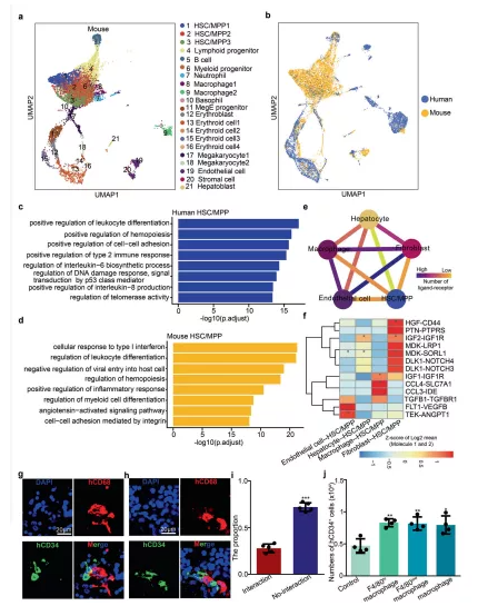 a E14.5 FL中所有細(xì)胞類(lèi)型的UMAP 可視化。b來(lái)自小鼠(E14.5)和人類(lèi)(受孕后 11 周)的 FL 細(xì)胞群的 UMAP 可視化。c對(duì)人類(lèi) HSCs/MPPs中top DEG 進(jìn)行 GO 生物過(guò)程相關(guān)的通路富集分析。d對(duì)小鼠 HSCs/MPPs 中top DEG進(jìn)行GO生物過(guò)程相關(guān)的通路富集分析。e配體-受體相互作用網(wǎng)絡(luò)展示了人 HSC/MPP與生態(tài)位細(xì)胞之間的潛在通訊網(wǎng)絡(luò)。f熱圖展示主要的人 HSCs/MPPs-生態(tài)位細(xì)胞相互作用對(duì)。g – h免疫熒光分析展示CD68(代表巨噬細(xì)胞)和 CD34(代表 HSCs/MPPs)在人受孕后第 11 周 FL 切片中的表達(dá)。i柱狀圖展示有和無(wú)細(xì)胞相互作用的 HSCs/MPPs 所占的比例。j源自小鼠巨噬細(xì)胞和 HSCs/MPPs 共培養(yǎng)系統(tǒng)的人 CD34 + HSCs/MPPs的數(shù)量。