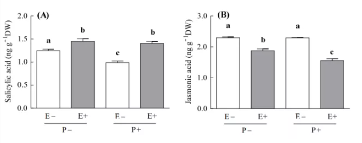 結(jié)果表明內(nèi)生真菌增加了植物SA濃度,與未接種病原菌的植株相比,內(nèi)生真菌增加了2倍的SA濃度(P+和P植物的內(nèi)生真菌分別使SA增加30%和14%)。與 SA 相反,內(nèi)生真菌降低了植株中JA濃度。接種病原菌的內(nèi)共真菌生植物與未接種的進行比較,茉莉酸的濃度降低了2倍。內(nèi)生真菌導致JA 濃度的減少,對于 P+和 P-植物分別為 32% 和 18%;