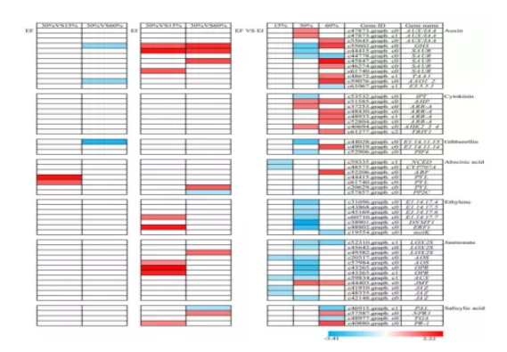 根據(jù)不同處理下的分析,我們共發(fā)現(xiàn)了 51 個與激素生物合成和反應途徑相關的 DEG。包括12個IAA相關基因、8個CTK相關基因、3個GA相關基因、7個ABA相關基因、7個ET相關基因、12個JA相關基因和4個SA相關基因。
