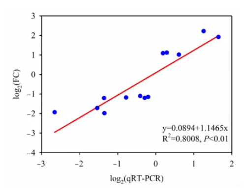 選擇了 13 個 DEG 進行 qRT-PCR 分析。線性回歸分析檢測到 qRT-PCR 和 RNA-seq 結(jié)果之間呈正相關,相關系數(shù)為0.8。因此,本研究中的 RNA-seq 結(jié)果準確可靠。