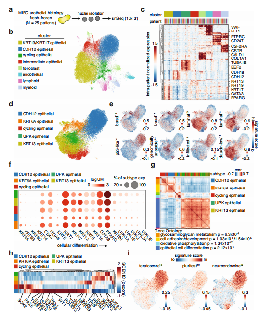 為了實(shí)現(xiàn)表征腫瘤內(nèi)異質(zhì)性的第一個(gè)目標(biāo),作者首先基于sn-RNAseq細(xì)胞類型比例研究了MIBC腫瘤的總體細(xì)胞組成(圖1a)。腫瘤由約90%的上皮細(xì)胞、5%的免疫細(xì)胞、3%的成纖維細(xì)胞和2%的內(nèi)皮細(xì)胞組成,這些細(xì)胞根據(jù)相應(yīng)的角蛋白、PTPRC、膠原蛋白、PECAM1、VWF等關(guān)鍵標(biāo)記基因(圖1b)。上皮間室無(wú)監(jiān)督聚類識(shí)別到了一個(gè)KRT13和KRT17差異表達(dá)的類群,KRT13、uroplakins(UPK)、KRT6A細(xì)胞周期相關(guān)基因類群,以及表達(dá)CDH12和其他上皮標(biāo)記物的細(xì)胞群(圖1d)。KRT13和UPK人群是僅有的兩個(gè)缺乏來(lái)自免疫浸潤(rùn)MIBC的基因標(biāo)記的人群,這表明在這些人群中富集的腫瘤代表免疫“冷”腫瘤(圖1e)。進(jìn)一步交叉參照傳統(tǒng)的尿上皮分化相關(guān)標(biāo)記表明,KRT13和UPK群體代表一個(gè)更分化的表型,而CDH12、KRT6A和cycle群體代表一個(gè)未分化或去分化的表型(圖1f)。如預(yù)期一樣KRT13和UPK群體表達(dá)了一個(gè)上皮細(xì)胞分化網(wǎng)絡(luò)(圖1g)?;趩渭?xì)胞調(diào)控網(wǎng)絡(luò)推斷和聚類分析,預(yù)測(cè)CDH12群體表現(xiàn)出多種發(fā)育相關(guān)轉(zhuǎn)錄因子的高活性,包括NANOG、EOMES、PAX1和HOXD9(圖1h)。CDH12和循環(huán)群體在干-樣和神經(jīng)內(nèi)分泌基因標(biāo)簽得分也高(圖1i)。