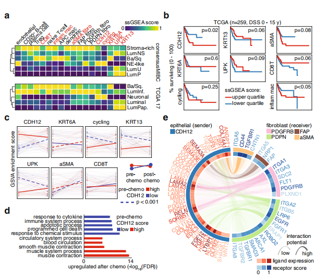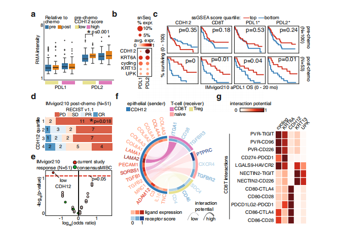 術(shù)前新輔助化療(NAC)和免疫檢查點(diǎn)治療(ICT)已經(jīng)徹底改變了膀胱癌的治療。然而,從這些模式中獲益最多的患者分層仍然是一個(gè)主要的臨床挑戰(zhàn)。作者將人類膀胱癌的單細(xì)胞核轉(zhuǎn)錄組、空間轉(zhuǎn)錄組和單細(xì)胞分辨率的空間蛋白組聯(lián)合分析,確定具有治療反應(yīng)預(yù)測(cè)能力的上皮細(xì)胞亞群。這些細(xì)胞表達(dá)Cadherin12(CDH12,N-Cadherin 2?)、catenins和其他上皮細(xì)胞的標(biāo)志物。CDH12富集的腫瘤可以定義患者是否接受NAC治療后預(yù)后效果差。富集CDH12的腫瘤對(duì)ICT表現(xiàn)出更好的效果。在所有情況下,通過(guò)對(duì)腫瘤CDH12富集進(jìn)行患者分層比目前膀胱癌亞型能更好的預(yù)后預(yù)測(cè)。CDH12群體類似于一種未分化的狀態(tài),具有固有的侵略性生態(tài)學(xué),包括化學(xué)耐藥性可能是通過(guò)祖細(xì)胞樣基因表達(dá)和成纖維細(xì)胞激活介導(dǎo)的。CDH12富集細(xì)胞表達(dá)PD-L1和PD-L2以及耗竭T細(xì)胞共定位,可能通過(guò)CD49a(ITGA1)介導(dǎo),為ICT在腫瘤中的功效提供一種解釋??傊狙芯棵枋隽艘粋€(gè)對(duì)膀胱癌治療具有反向應(yīng)答的癌細(xì)胞群。重要的是還為臨床標(biāo)志物的篩選提供了一個(gè)令人信服的框架。