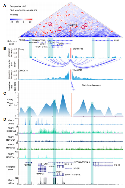 文章探索了卵巢組織的 Hi-C 相互作用并在卵巢組織和 GM12878(作為對照)之間進行了比較 Hi-C 圖(圖 1A),發(fā)現(xiàn) FOXN2、STON1-GTF2A1L、STON1、GTF2A1L 和 FSHR是 rs13405728 (Chr2:48978158) 基因座的假定目標,在卵巢組織中具有相互作用(圖 1B)。