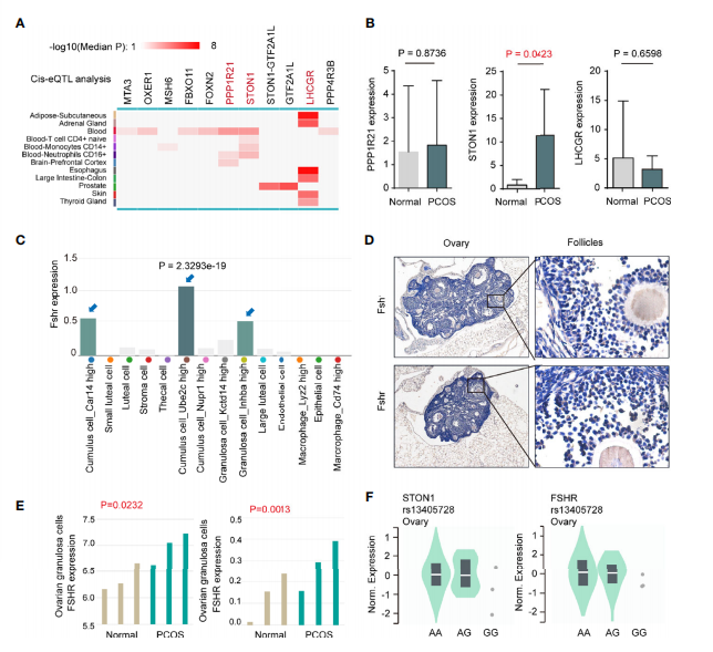 圖F 來自正常卵巢組織的 rs13405728 位點的 STON1 和 FSHR 的單組織 eQTL 分析。PCOS,多囊卵巢綜合征;eQTL,表達數(shù)量性狀基因座。