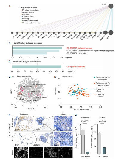 圖E 來自 GSE135917 數(shù)據(jù)集的男性和女性 STON1 表達與 BMI 之間的相關性分析。來自脂肪飲食小鼠的脂肪組織和卵巢組織中 STON1 的 IHC 染色 (F) 和染色評分 (G)。GO,基因本體論;tSNE,t-distributed 隨機鄰居嵌入;BMI,體重指數(shù);IHC,免疫組織化學。
