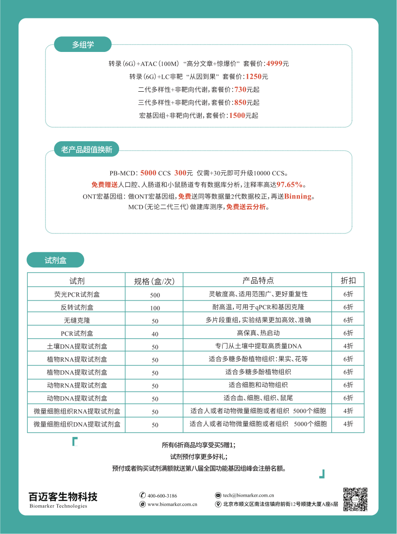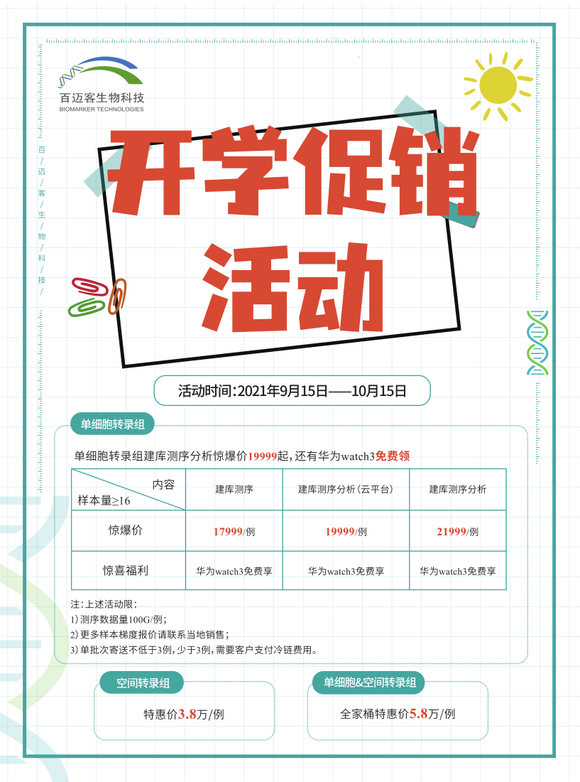 百邁客為您提供了最實惠的開學(xué)季促銷好禮,產(chǎn)品覆蓋二代微生物、三代微生物、微生物多組學(xué)以及單細胞系列產(chǎn)品,詳情活動可見:百邁客醫(yī)學(xué)開學(xué)促銷活動,快快上車~
