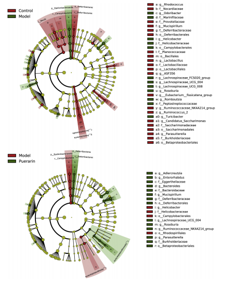 門水平的分類分析表明,厚壁菌門、擬桿菌門和放線菌門在所有類群的糞便微生物群落中占優(yōu)勢。與對照組相比,模型組的Epsilonbacteraeota水平較高,而葛根素處理可逆轉(zhuǎn)這一趨勢(圖7D)。采用LEfSe方法,篩選出LDA評分大于2.0的明顯改變的類群,以鑒定類群間(門到屬)的差異類群。如圖8和圖9所示,在對照組和模型組之間,模型和葛根素組之間,共發(fā)現(xiàn)了40和24個不同的細菌分類分支。有趣的是,在葛根素治療后,14種不同的細菌類群在NASH小鼠中顯示出相同的恢復(fù)正常水平的趨勢,包括p Epsilonbacteraeota, c Campylobacteria、o彎曲菌目、 f 螺桿菌科、 g幽門螺桿菌屬、p 脫鐵桿菌門、c 脫鐵桿菌、 o 脫鐵桿菌、 f 脫鐵桿菌科、g Mucispirillum、o Betaproteobacteriales、f burkholderaceae、g Parasutterella 和g瘤胃球菌科NK4A214組。值得一提的是,模型小鼠中氏菌屬的成員比對照組小鼠大,葛根素治療后進一步擴大。(字母 p、c、o、f 和 g 分別代表門、綱、目、科和屬)