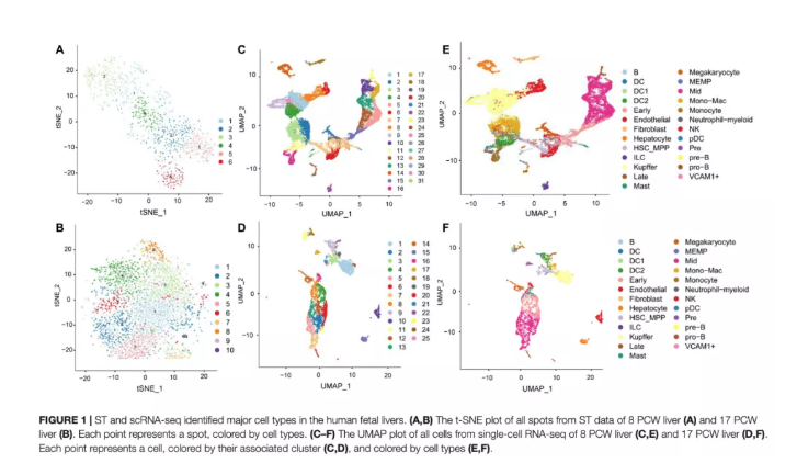 為了研究胎兒肝臟中免疫細胞和紅細胞的發(fā)育,作者利用ST技術(shù)分析了人類肝臟發(fā)育過程中基因表達的時空動態(tài)。在篩選數(shù)據(jù)后,在8周PCW肝臟中檢測到1267個高質(zhì)量spots,平均每個spot包含204,628條reads,檢測到1,132個基因和5,924個UMIs。在17周PCW中,肝臟由3,489個單獨spots組成,平均78,576條reads,8,829個UMI,過濾后每個點檢測到2,266個基因。通過對每個ST陣列的spots進行降維和聚類,根據(jù)基因表達模式在8周PCW肝臟(圖1A)和17周PCW肝臟(圖1B)中確定了6個和10個主要cluster。由于ST缺乏細胞分辨率,作者利用scRNA-seq技術(shù)研究了8周PCW和17周PCW活組織的基因表達異質(zhì)性。在應用質(zhì)量控制過濾器和標準化后,scRNA序列數(shù)據(jù)分別25,186個細胞和9,153個細胞組成,每個細胞中有2,454和2,705個獨特表達的基因。為了探索活體器官的細胞組成,作者處理了單細胞數(shù)據(jù),并在8和17周PCW肝臟中鑒定了31和25種細胞狀態(tài),每種狀態(tài)都根據(jù)文獻中已知的標記基因進行了注釋(圖1C-F)。作者將這些cluster鑒定為B細胞、樹突狀細胞(DC)、DC1、DC2、早期成紅細胞、內(nèi)皮細胞、HSC_MPP、成纖維細胞、肝細胞、kuper、ILC、晚期成紅細胞、MEMP、肥大細胞、巨核細胞、中成紅細胞、單核細胞、中性粒細胞、NK、pDC、Pre、Pre-B、Pro-B和VCAM1+。