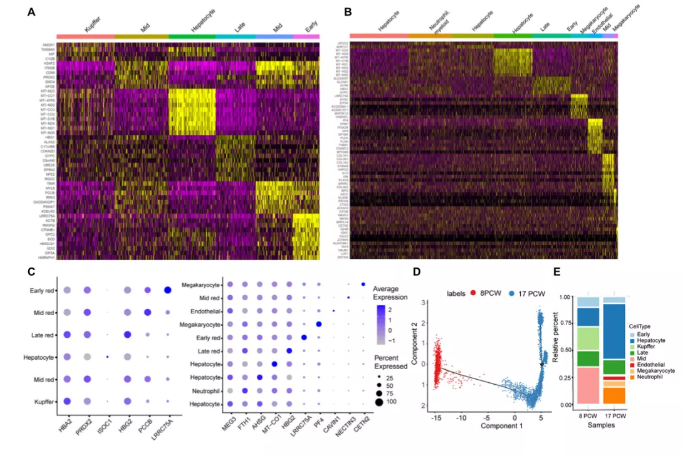 對下調(diào)基因的KEGG富集分析顯示,最顯著的包括果糖和甘露糖代謝、半胱氨酸和蛋氨酸代謝、?;撬岷偷团;撬岽x、組氨酸和硫胺代謝相關的信號通路。上調(diào)基因的高度富集項與丙酸代謝有關(圖5D)。作者進行了早、中、晚期細胞間的配體-受體相互作用分析,發(fā)現(xiàn)在早期-中晚期細胞通訊中發(fā)現(xiàn)了促紅細胞生成素(EPO)、蛋白酪氨酸磷酸酶受體C(PTPRC)、連接蛋白細胞粘附分子3(NECTIN3)(圖5E)。此外,還對紅細胞的分化軌跡進行了分析,得出了一條緊密相連的分化軌跡,分化成五個主要分支(圖5F)。這表明系統(tǒng)是通過一個連續(xù)的而不是幾個斷開的譜系來維持的。此外,在8PCW肝臟和17PCW肝臟的早期、中期和晚期紅細胞中分別鑒定了617、674和503個DEGs。為了進一步了解8PCW肝臟和17PCW肝臟之間紅細胞的差異,對兩個胚胎階段的基因表達模式進行了PCA分析。從每種細胞類型中取樣50個點以產(chǎn)生平衡的數(shù)據(jù)集,并且發(fā)現(xiàn)基于它們的轉(zhuǎn)錄相似性可以區(qū)分8 PCW和17 PCW肝臟中的所有點(圖5G,H)。