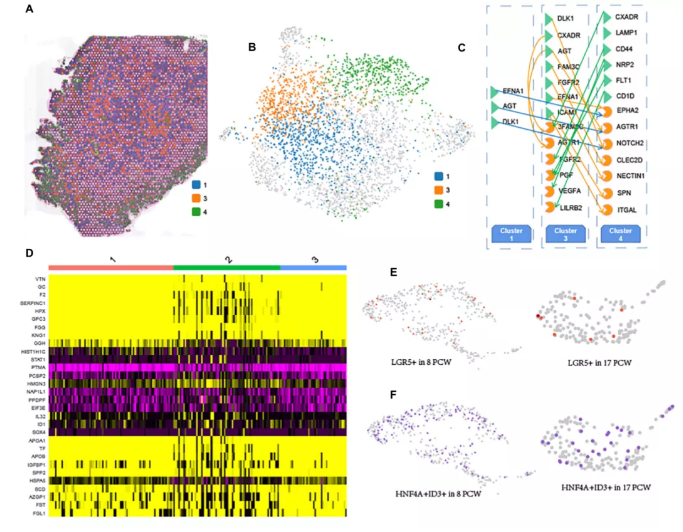 如圖3E所示,肝細胞是17 PCW肝臟的主要實質(zhì)細胞。作者觀察到三個不同的肝細胞cluster(cluster1、3和4)沿著17周PCW肝臟的空間深度分布(圖4A、B)。作者發(fā)現(xiàn)MEG3、ITIH3和HMGCS1呈cluster1高表達。FGB、IGFBP1和A2M基因在cluster3中表達更高,表明區(qū)域DEGs可能參與了相應區(qū)域特異性功能的形成。此外,cluster4組中的肝細胞高表達數(shù)個基因,包括MT-CO1、MT-CO2、MT-CO3,它們參與線粒體電子傳遞和氧化磷酸化。值得注意的是,cluster1和3主要聚集在肝組織的中心區(qū)域,cluster4主要聚集在肝的周圍區(qū)域(圖4a)。差異表達分析的熱圖顯示肝細胞分化過程中逐漸下調(diào)或上調(diào)的基因。GO分析表明,1-3-4cluster中逐漸上調(diào)的基因主要與細胞極性通路、Wnt信號通路和GTPase活性的調(diào)節(jié)有關,而逐漸下調(diào)的基因則參與壞死細胞死亡、糖原生物合成過程的調(diào)節(jié),肝臟再生。此外,作者描述了cluster1-3-4細胞之間的細胞通訊(圖4C),為將來的研究提供了潛在的信號轉(zhuǎn)導信息。值得注意的是,盡管cluster3和cluster1的距離更近,但cluster3與cluster4細胞的信號轉(zhuǎn)導比cluster1細胞更為顯著。此外,作者還發(fā)現(xiàn)了一些共享的和活躍的配體-受體對,如DLK1-NOTCH2、EFNA1EPHA2、AGT-AGTR1,這些配體-受體對既存在于cluster1細胞與cluster4細胞的細胞通訊中,也存在于cluster3細胞與cluster4細胞的細胞通訊中。
