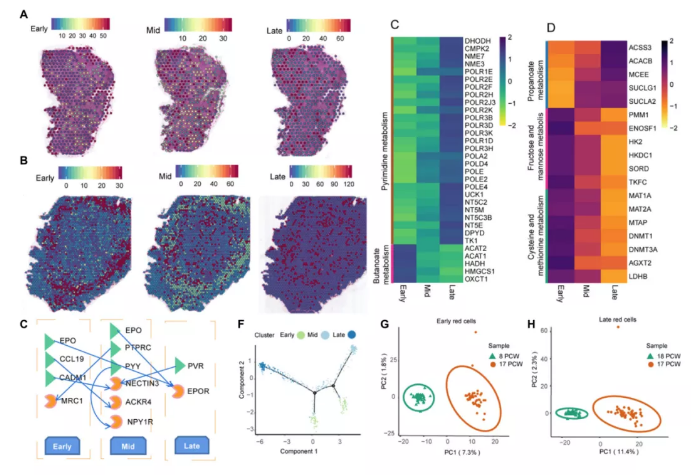 在8PCW肝臟中,小的紅細胞簇散布在整個肝臟中(圖5A)。在17PCW肝臟中,肝臟充滿了紅細胞,并且完全變紅(圖5b)。值得注意的是,早期的紅細胞位于肝組織的外圍,而中期紅細胞和晚期紅細胞則分散在肝組織的中心區(qū)域(圖5B)。這一戲劇性的形態(tài)學變化表明,在實驗研究期間,人類胎兒肝臟都經(jīng)歷了血液的快速生長和遷移。在8和17PCW肝中均有早、中、晚期成紅細胞。為了研究紅細胞的發(fā)育過程,作者研究了這三種類型紅細胞間差異表達的基因。在8PCW肝臟中,818個基因在早、晚分化過程中逐漸下調(diào),2648個基因在早、晚分化過程中逐漸上調(diào)。逐漸上調(diào)的基因富含乙醛酸和二羧酸代謝、嘧啶代謝、果糖和甘露糖代謝、丙酮酸代謝和嘌呤代謝,而逐漸下調(diào)的基因與丁酸代謝相關(圖5C)。在17PCW肝組織中,有812個基因在分化早期、中晚期逐漸下調(diào),880個基因在分化早期、中晚期逐漸上調(diào)。