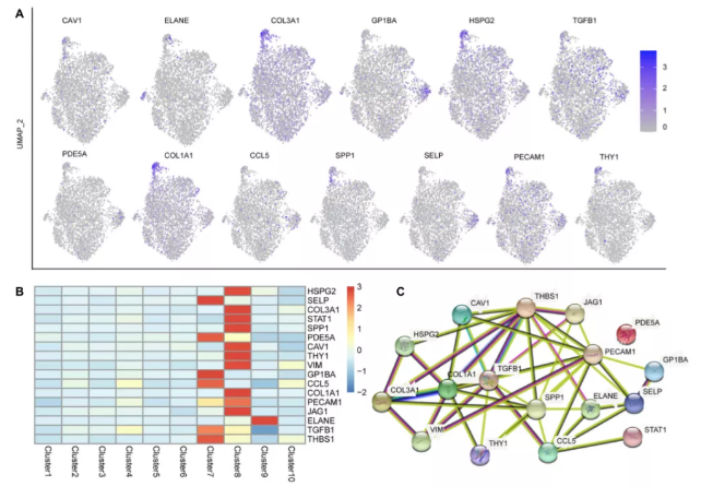 為了進一步揭示這一現(xiàn)象,作者分析了這17種肝病相關基因在17PCW胚胎腎臟中的表達水平。除PECAM1外,其余基因在17PCW腎中表達。但其表達模式與肝臟不同,主要不在巨核細胞和內(nèi)皮細胞中表達,說明這些肝病相關基因在胚胎肝臟中具有獨特的基因表達模式。此外,對這17個肝病相關基因的蛋白質(zhì)相互作用網(wǎng)絡分析顯示TGFB1、COL1A1、SPP1、PECAM1和THBS1在表達網(wǎng)絡中起關鍵作用,而PDE5A與其他基因沒有相互作用(圖6C)。