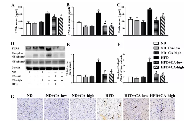 有報(bào)道稱(chēng),NAFLD的特征是腸道菌群改變、炎癥和腸道屏障破壞。肝組織炎癥被認(rèn)為是肝脂肪變性發(fā)展的驅(qū)動(dòng)因素,腸道源性脂多糖被認(rèn)為在肝臟炎癥中具有致病作用。最近的動(dòng)物實(shí)驗(yàn)研究關(guān)注了腸道菌群LPS在NAFLD發(fā)生中的作用。腸道源性L(fǎng)PS是革蘭氏陰性菌外膜的主要成分,通過(guò)TLR4信號(hào)通路和下游炎癥級(jí)聯(lián)反應(yīng)促進(jìn)炎癥反應(yīng)。有報(bào)道稱(chēng),在NAFLD模型中,與野生型小鼠相比,tlr4缺陷小鼠的肝損傷、炎癥和脂質(zhì)積累減少。此外,阻斷腸道菌群與宿主細(xì)胞之間的脂多糖- tlr4相互作用可以阻止高脂喂養(yǎng)小鼠NAFLD的啟動(dòng)和發(fā)展,這證實(shí)了脂多糖- tlr4通路在誘導(dǎo)NAFLD中具有非常重要的作用。與之前的研究結(jié)果一致,我們的研究表明,16周高脂飲食導(dǎo)致血清LPS和肝臟TLR4表達(dá)顯著增加,肝組織中磷酸化的NF-kB p65被激活,表明炎癥開(kāi)始。同時(shí),高脂喂養(yǎng)小鼠血清TNF-a、IL-6水平升高,肝臟mpo陽(yáng)性細(xì)胞浸潤(rùn)。所有劑量的CA補(bǔ)充均顯著扭轉(zhuǎn)了上述現(xiàn)象;在添加ca的ND組中沒(méi)有觀(guān)察到顯著差異(圖4A-G)。
