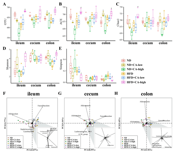 研究了6組中回腸、盲腸、結(jié)腸3個(gè)腸段內(nèi)容物中腸道菌群組成的變化。如圖5A所示,與ND組相比,HFD小鼠回腸腸道菌群中觀(guān)察到的OTUs明顯降低,同時(shí)盲腸和結(jié)腸的OTUs也有下降趨勢(shì)。添加0.16% CA的HFD組小鼠回腸和結(jié)腸OTUs顯著增加。有趣的是,在添加0.08% CA的ND組中,除了結(jié)腸OTUs的減少外,添加CA可導(dǎo)致正常飼糧小鼠OTUs的減少。進(jìn)行Alpha多樣性分析,包括ACE(圖5B)、Chao1(圖5C)、Shannon(圖5D)和Simpson指數(shù)(圖5E)。ACE、Chao1、Shannon和Simpson的變化與OTUs的變化平行,表明HFD破壞了腸道菌群的豐富度和多樣性。同時(shí),添加CA可在一定程度上恢復(fù)植物區(qū)系的豐富度和多樣性,尤其是在HFD中添加0.16% CA時(shí)。在ND組中添加CA導(dǎo)致了微生物群落豐富度和多樣性的降低,表明其作用可能與HFD組不同。此外,已知多酚可以下調(diào)微生物多樣性,顯著抑制致病菌的生長(zhǎng);因此,添加CA的ND組細(xì)菌OTU、豐富度和多樣性的降低可能與CA的抑菌作用有關(guān)。利用Beta多樣性分析分析腸道菌群整體結(jié)構(gòu)的變化。主成分分析顯示不同的微生物群組成和單獨(dú)的集群之間HFD老鼠和ND老鼠,和HFD老鼠和HFD之間補(bǔ)充高濃度的CA。然而,HFD小鼠的腸道微生物群補(bǔ)充CA濃度較低的不是明顯不同于回腸HFD老鼠,盲腸和結(jié)腸。此外,ND處理組間的微生物菌群組成沒(méi)有差異(圖5F、G和H)。PCA識(shí)別出回腸、盲腸和結(jié)腸中兩個(gè)最易變的菌群——Allobaculum和Faecalibaculum,這意味著它們導(dǎo)致了組間觀(guān)察到的差異。PCA結(jié)果顯示,PC1(48.59%)具有a盲腸總方差高于PC2(21.36%),說(shuō)明CA處理可使hfd誘導(dǎo)的腸道菌群組成與ND組相似。通過(guò)beta多樣性分析,我們發(fā)現(xiàn)CA處理組(特別是添加0.16% CA)和HFD處理組具有不同的菌群組成,提示CA對(duì)腸道菌群的修飾作用。