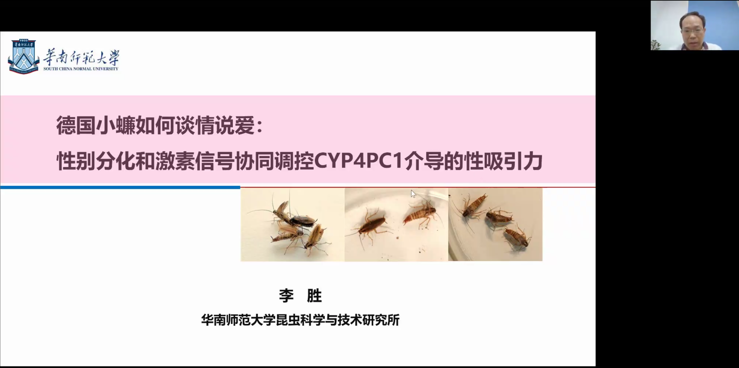 華南師范大學李勝教授風趣的為我們介紹了德國小蠊性激素調(diào)控相關(guān)研究。研究團隊通過轉(zhuǎn)錄組及相關(guān)驗證實驗,在觸角中找尋到雄蟲中表達量高于雌蟲基因的CYP4PC1基因,該基因可能是控制信息素合成的關(guān)鍵基因。通過基因敲除的方式進一步從表型中驗證了CYP4PC1在信息素的產(chǎn)生和求偶的過程中具有重要的作用。后續(xù)研究表明,性別分化基因控制性二型CYP4PC1表達與調(diào)控,性別分化和激素信號協(xié)同調(diào)控CYP4PC1性吸引力,并使得小蠊成熟時只有一種性別具有性吸引力。最后李教授表明,通過性別分化和激素信號協(xié)同調(diào)控性吸引力可能在昆蟲和哺乳動物中普遍存在。