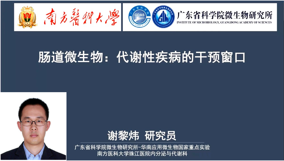 廣東省微生物研究所謝黎煒研究員講解了“腸道微生物:代謝性疾病的干預(yù)窗口”謝老師首先介紹了腸道菌群是多因素誘發(fā)肥胖癥的承載體,代謝性疾病,例如:2型糖尿病,肥胖和代謝性肝病等,嚴(yán)重?fù)p害身體健康,甚至致殘致死。研究發(fā)現(xiàn)代謝性疾病的發(fā)生和發(fā)展伴隨腸道微生物多樣性、種類和功能的變化,謝老師團(tuán)隊近期開展的短期理床低碳減重研究和益生菌代謝產(chǎn)物緩解機(jī)體糖脂代謝的研究為代謝性疾病的腸道干預(yù)提供了有力的證據(jù)。