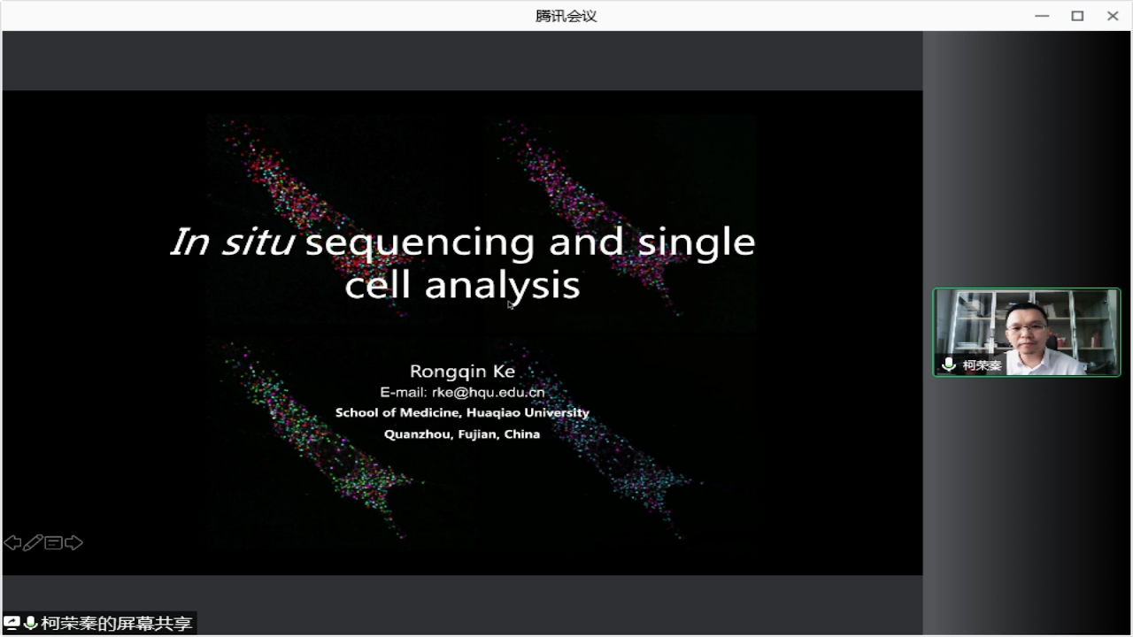 午后休息結束,華僑大學醫(yī)學院柯榮秦教授帶來的報告是:原位測序技術與單細胞分析?;趩渭毎麥y序的基因表達分析需要將單個細胞從組織中分離出來,這個過程使所分析的單細胞丟失了空間位置信息??吕蠋焾F隊開發(fā)了原位測序(in situ sequencing, ISS),是一種基于成像的空間轉錄組學技術。該技術可以在細胞甚至亞細胞分辨率下提供低通量到高通量的空間基因表達信息,將ISS技術應用于癌癥組織中基因表達異質(zhì)性的可視化分析,并將之應用于人腦組織單細胞測序所獲得的感興趣的基因的定位以補充其失去的空間位置信息。此外,還開發(fā)了一系列新型的具有更高的檢測靈敏度和更好的分辨率的單分子RNA原位雜交方法,可以在細胞和組織中對感興趣的RNA轉錄本進行原位成像分析。我們相信我們所開發(fā)的原位RNA表達分析技術具有廣泛地用于生物和醫(yī)學的研究的潛力。