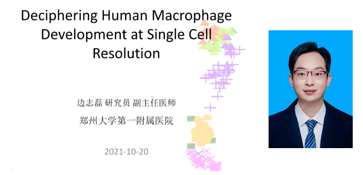 前面兩場報告湯老師和曹老師都是開發(fā)了單細胞空間新技術,這些技術如何實現(xiàn)在臨床醫(yī)學,特別是在腫瘤中精準輔助治療應用呢?鄭州大學第一附屬醫(yī)院血液科副主任醫(yī)師邊志磊研究員報告題目是:Deciphering human macrophage development at single-cell resolution,以超高單細胞分辨率深度解析了巨噬細胞發(fā)育。邊老師團隊繪制了巨噬細胞在多個解剖部位的異質(zhì)性,并確定了不同的亞群,包括各種類型的胚胎組織駐留巨噬細胞(TRMs)(在頭部、肝臟、肺和皮膚)。追蹤了胚胎卵黃囊來源的原始巨噬細胞或卵黃囊衍生的偏髓性祖細胞(YSMPs)來源的胚胎肝單核細胞中TRM的發(fā)育軌跡,評估了胚胎期TRM和成年期TRM之間的分子相似性。全面描述了人類胚胎發(fā)生過程中早期巨噬細胞發(fā)育的時空動態(tài)特征,為進一步研究人類TRM的發(fā)育和功能提供了參考。