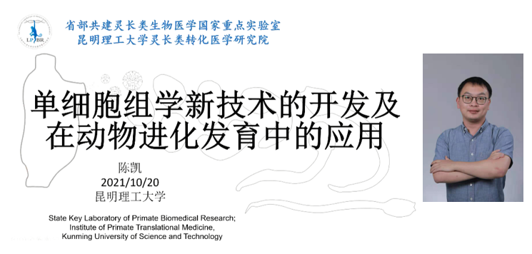 昆明理工大學省部共建非人靈長類生物醫(yī)學國家重點實驗室陳凱教授帶來的報告題目是單細胞組學新技術的開發(fā)及在動物進化發(fā)育中的應用。陳老師團隊通過結合單細胞功能組學技術和經(jīng)典發(fā)育生物學方法,成功繪制了完整的脊索動物胚胎發(fā)育單細胞轉錄譜系以及對應的調(diào)控網(wǎng)絡草圖,在此基礎上發(fā)現(xiàn)了多巴胺神經(jīng)元命運決定的保守因子(Meis和Ptf1),并開發(fā)出了基于CUT&Ta研究多個目的蛋白-DNA互作的新方法(Multi-CUT&Tag),結合10x多組學平臺,該方法能有效地整合細胞類型特征和染色質(zhì)的信息,有利于獲得更加清晰的細胞譜系和染色質(zhì)特征,有助于解析細胞命運決定背后的調(diào)控機制。
