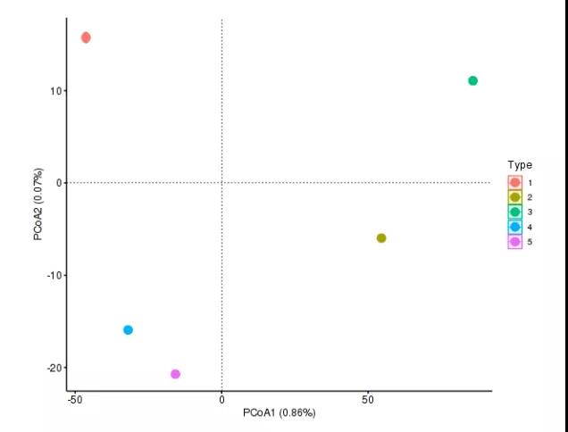 分型分析,主要通過(guò)統(tǒng)計(jì)聚類(lèi)的方法研究不同樣本菌群物種/功能結(jié)構(gòu)的分型情況。分型分析過(guò)程中一般不考慮環(huán)境因子等外部因素的影響。通過(guò)分型分析,可以將菌群物種/功能結(jié)構(gòu)相似的不同樣本聚為一類(lèi),主要適用于特定環(huán)境樣本的菌群/功能分型,如腸道型(enterotypes)、口腔分型等。通常根據(jù)菌群在所選分類(lèi)水平上的相對(duì)豐度,計(jì)算 Jensen-Shannon Distance和PAM (Partitioning Around Medoids)進(jìn)行聚類(lèi),通過(guò) Calinski-Harabasz (CH)指數(shù)計(jì)算最佳聚類(lèi) K 值,然后采用 Between-class analysis (BCA)或principal coordinates analysis (PCoA)進(jìn)行可視化。