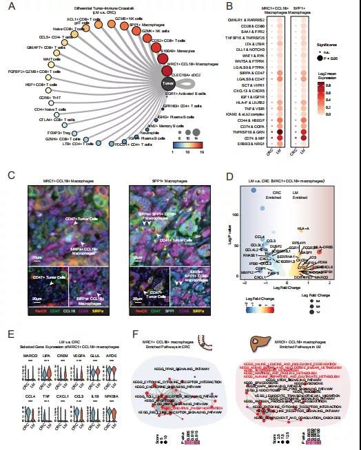 本研究進(jìn)行了基于配體-受體的癌癥-免疫串?dāng)_分析,并在原發(fā)部位和轉(zhuǎn)移部位之間進(jìn)行比較(圖 2A),發(fā)現(xiàn)SPP1+巨噬細(xì)胞和MRC1+ CCL18+巨噬細(xì)胞在LM和CRC之間的差異較大,這一結(jié)果表明肝轉(zhuǎn)移癌細(xì)胞可能優(yōu)先重編程巨噬細(xì)胞并誘導(dǎo)其特定的功能狀態(tài)(圖 2A)。值得注意的是,LM中的轉(zhuǎn)移性腫瘤細(xì)胞優(yōu)先表達(dá)配體CD47,這是一個(gè)重要的檢查點(diǎn),因此可能招募相應(yīng)的受體SIRPA或激活MRC1+ CCL18+巨噬細(xì)胞(圖 2B)。進(jìn)一步利用mIHC來可視化這些蛋白質(zhì),觀察CD47+腫瘤細(xì)胞和SIRPA+巨噬細(xì)胞之間的串?dāng)_(圖 2C)。這些配體-受體對(duì)為靶向治療肝轉(zhuǎn)移提供了線索。