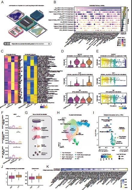 為了說明代謝重編程與巨噬細(xì)胞表型變化的關(guān)聯(lián),本研究計(jì)算了巨噬細(xì)胞的經(jīng)典通路評(píng)分,例如抗原加工、呈遞、炎癥、血管生成、免疫抑制、吞噬作用、白細(xì)胞介素信號(hào)通路和補(bǔ)體評(píng)分(圖 3J)。在LM中,MRC1+ CCL18+巨噬細(xì)胞的抗原加工和呈遞以及補(bǔ)體活性評(píng)分顯著增加(圖 3J),SPP1+巨噬細(xì)胞也顯示出類似的趨勢(shì)。某些基因如HLA-A(MHC I類分子之一)在LM的MRC1+ CCL18+巨噬細(xì)胞中上調(diào)。進(jìn)一步分析了42種腫瘤高代謝途徑與MRC1+ CCL18+巨噬細(xì)胞通路評(píng)分之間的相關(guān)性,發(fā)現(xiàn)包括戊糖和葡萄糖醛酸互變?cè)趦?nèi)的幾種巨噬細(xì)胞特異性代謝途徑與LM中的抗原加工和呈遞有很強(qiáng)的相關(guān)性,但在CRC的相關(guān)性很弱(圖 3K)。這些數(shù)據(jù)表明不同的代謝功能在MRC1+ CCL18+巨噬細(xì)胞表型中的潛在作用。