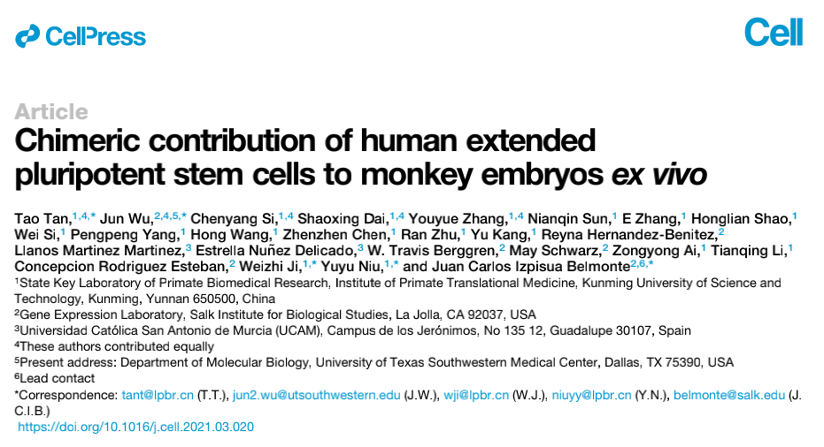 用人多能干細胞(hPSC)形成種間嵌合體已成為在體內(nèi)評估hPSC多能性的有效方案,并且 可能在再生醫(yī)學(xué),包括移植器官和組織再生中發(fā)揮重要作用。使用小鼠和豬胚胎的研究表明, hPSCs并不能有力地促進與人類進化距離較遠的物種的嵌合體形成。本研究主要是在體外培養(yǎng)的 食蟹猴(Macaca fascicularis)胚胎中研究人擴展多能干細胞(hEPSC)的嵌合能力,證明 hEPSCs能夠在食蟹猴胚胎中存活、增殖,并繪制植入前后細胞圖譜。同時還發(fā)現(xiàn)了種間細胞相 互作用,這些事件可能有助于塑造嵌合胚胎內(nèi)人類和食蟹猴細胞的獨特發(fā)育軌跡。本研究結(jié)果 可能有助于更好地了解早期人類胚胎發(fā)育和靈長類動物進化,并制定策略以改善進化距離較遠 的物種的人類嵌合體的形成。