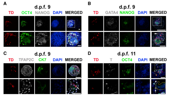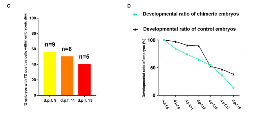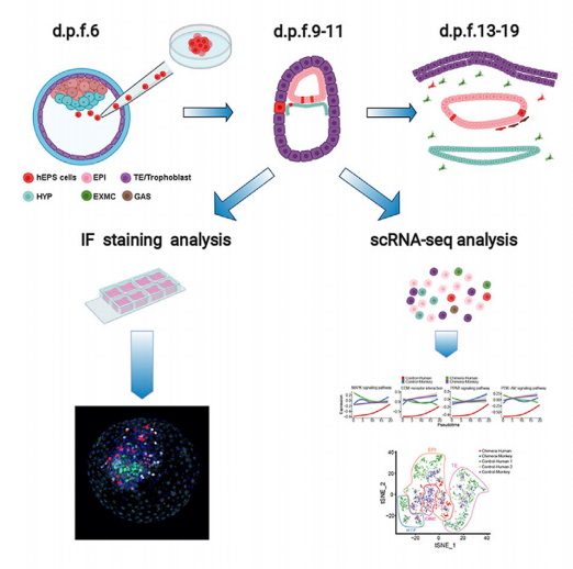 圖2 hEPSCs有助于植入后食蟹猴胚胎中的嵌合體形成