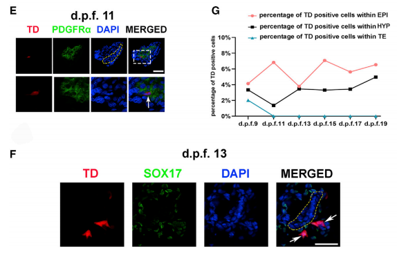 為研究食蟹猴胚胎中hEPSC的發(fā)育潛力,本研究使用幾種胚胎和胚胎外譜系特異性抗體進 行了免疫熒光(IF)研究。在圍植入期(d.p.f.9),平均有10.2±7.2(n = 9)個iPS1-EPSCs被 發(fā)現(xiàn)(在NANOG+或OCT4+食蟹猴細胞內(nèi)或附近發(fā)現(xiàn)TD+ OCT4+細胞)(圖 2A)。盡管這些 細胞表達OCT4,但只有少數(shù)細胞表達NANOG(圖 S1C),沒有在這些細胞中觀察到GATA6 表達(一種下胚層【HYP】標(biāo)記)(圖 S1C)。 此外,還檢測到TD+GATA4+ HYP-like細胞 (圖 2B)。與小鼠中報道的結(jié)果相反(Yang et al., 2017),在食蟹猴囊胚的滋養(yǎng)外胚層 (TE)層中僅檢測到少數(shù)iPS1-EPSC表達了TE標(biāo)記基因(例如TFAP2C和CK7)(圖 2C)。 在d.p.f.11時,食蟹猴胚胎的EPI層也檢測到TD+OCT4+細胞,這些細胞很少表達原腸胚形成標(biāo)志物T+(也稱為Brachyury)。相比之下,在胚胎的背側(cè)羊膜處檢測到T+食蟹猴細胞(圖 2D)。此外,在食蟹猴HYP細胞內(nèi)發(fā)現(xiàn)表達HYP標(biāo)志物、血小板衍生生長因子受體-α (PDGFRα)的TD+人類細胞(圖 2E)。在EPI層外發(fā)現(xiàn)了表達COL6A1的OCT4+人類細胞, COL6A1是胚胎外間充質(zhì)細胞(EXMC)的標(biāo)志物,表明hEPSC正在向EXMC分化(圖 S1D)。在 d.p.f.13時,EPI層下方檢測到hEPSCs并表達內(nèi)胚層標(biāo)記物SOX17,表明它們已啟動 原腸胚形成(圖 2F)。有趣的是,本研究發(fā)現(xiàn)從d.p.f.13開始,人類細胞傾向于聚集在一起并 與食蟹猴EPI層分離,通過檢測OTX2和OCT4的表達,發(fā)現(xiàn)這些人類細胞似乎已分化為原腸細 胞(Martyn et al., 2018; Vincent et al., 2003)(圖 S1E)。總的來說,hEPSCs對EPI的貢獻較高 (在d.p.f.15時的最高貢獻值為7.08%),對HYP的貢獻相對較低(在d.p.f.19時的最高貢獻為 4.96%)(圖 2G)。