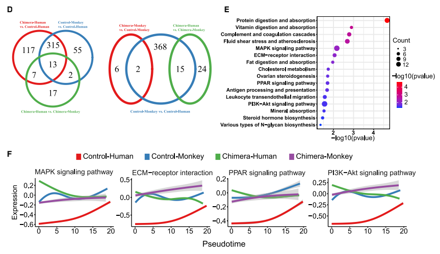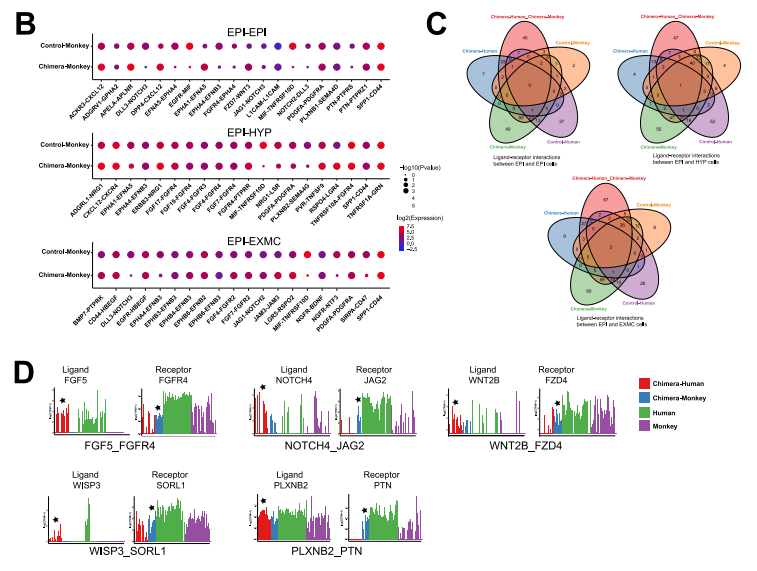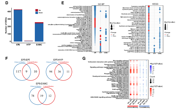 由于食蟹猴的細胞在人類細胞存在下表現(xiàn)出轉(zhuǎn)錄組的變化,接下來分析了嵌合胚胎中食蟹 猴細胞的發(fā)育動態(tài)。首先確定了嵌合猴胚胎和對照猴胚胎之間的差異表達基因(DEG)。EPI 細胞、HYP細胞和EXMCs細胞與對照胚胎相比,嵌合體細胞中分別有424、7和241個基因下 調(diào),5、2 和13個基因上調(diào)(圖 4D 和 S3A)。GO和KEGG富集分析確定了在嵌合猴EPI細胞、 HYP細胞和EXMCs細胞中上調(diào)和下調(diào)基因的信號通路,如Hippo和轉(zhuǎn)化生長因子β(TGF-β) 信號通路分別在嵌合猴EPI細胞和EXMCs細胞中下調(diào)(圖 4E)。 已經(jīng)證明食蟹猴EPI細胞的轉(zhuǎn)錄組譜在嵌合胚胎中發(fā)生了改變,接下來研究了食蟹猴EPI胚 胎生態(tài)位是否也受到人類細胞的影響。CellPhoneDB(v2.0.1)(Vento-Tormo et al., 2018)可 鑒定嵌合胚胎和對照胚胎中EPI和其他譜系(HYP 和 EXMCs)之間細胞的潛在相互作用。結(jié)果發(fā)現(xiàn)與對照胚胎相比,嵌合胚胎中有更多的配體-受體相互作用(如,在猴EPI細胞中檢測到 117個 [嵌合] 與10個 [對照] 特異性配體-受體相互作用)(圖 4F 和 S3B)。進行KEGG分析發(fā) 現(xiàn),嵌合胚胎中被加強的信號通路包括磷脂酰肌醇 3-激酶 [PI3K]-Akt、絲裂原活化蛋白激酶 [MAPK] 信號通路和WNT信號通路(圖 4G)。使用相同的方法,還確定了嵌合胚胎內(nèi)人和猴 細胞-細胞的相互作用,如FGF5-FGFR4、NOTCH4-JAG2、WNT2B-FZD4、WISP3-SORL1和 PLXNB2- PTN(圖 S3C 和 S3D)。結(jié)果表明,嵌合胚胎內(nèi)的細胞間相互作用得到加強,并可 能導(dǎo)致其他信號通路的激活。
