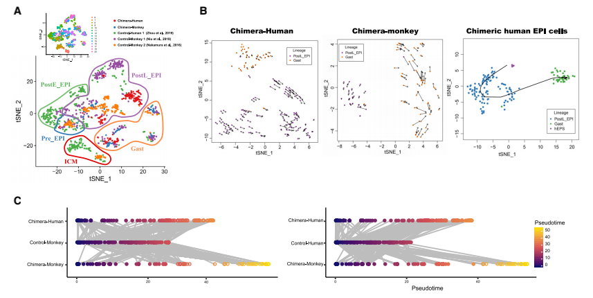 圖5 食蟹猴胚胎中嵌合人EPI-like細胞的發(fā)育軌跡