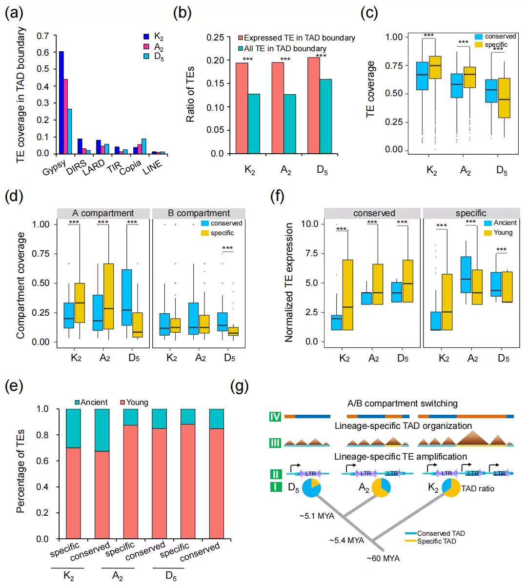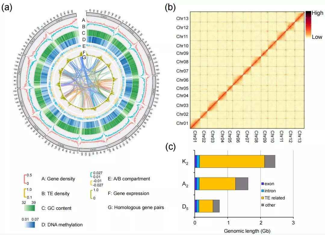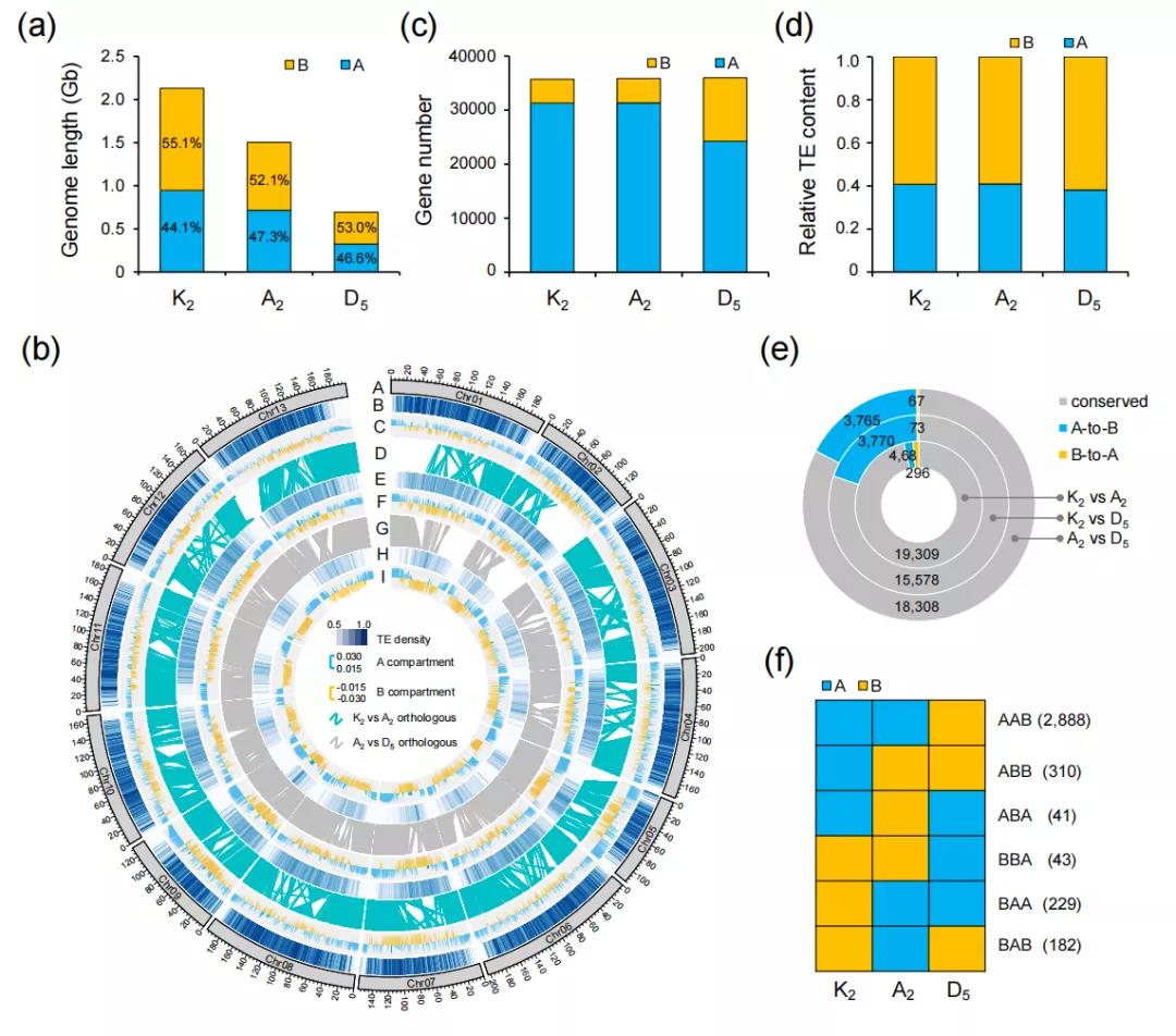 植物染色質(zhì)被劃分為“活性”(A)或“非活性”(B)區(qū)域,通常分別對應于常染色質(zhì)和異染色質(zhì)。HiC染色質(zhì)互作分析發(fā)現(xiàn),與基因組大小的差異一致,與A2或D5相比,K2基因組的活躍區(qū)域(約占基因組的44%)較少,而非活躍區(qū)域(55%)較多。較大的K2和A2基因組在A/B compartment之間表現(xiàn)出更多的插入,與這些較大基因組中發(fā)現(xiàn)的富含TE的區(qū)域相對應。A2/K2與D5相比多了約7000個基因,這與活躍的轉(zhuǎn)座子擴增相關(guān)。對于較大的基因組,一個compartment中TEs的比例也稍大,表明這些較大基因組(K2和A2)所顯示的A/B compartment變化模式導致更擴散的邊界,并在A compartment中包含更多的基因和TEs。