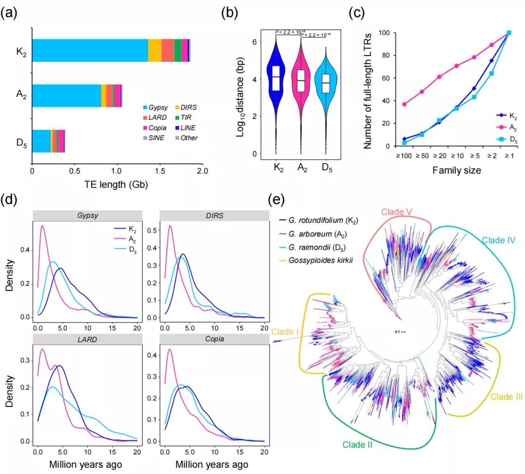 通過從頭預測、同源預測與轉(zhuǎn)錄預測結(jié)合的方式,在K2、A2和D5分別注釋到41,590, 41,778與40,820個基因。與許多植物一樣,三種棉中重復序列非常豐富,分別占到了每個基因組的57-81%,并且含量隨基因組的增加而擴張(K2=1978 Mb、A2=1103 Mb和D5=428 Mb)(圖1)。重復序列注釋表明,棉種特異的反轉(zhuǎn)錄轉(zhuǎn)座子(LTR)擴增是造成D5、K2和A2這三個棉種基因組大小呈現(xiàn)三倍差異的原因, 尤其是Gypsy和DIRS類型。