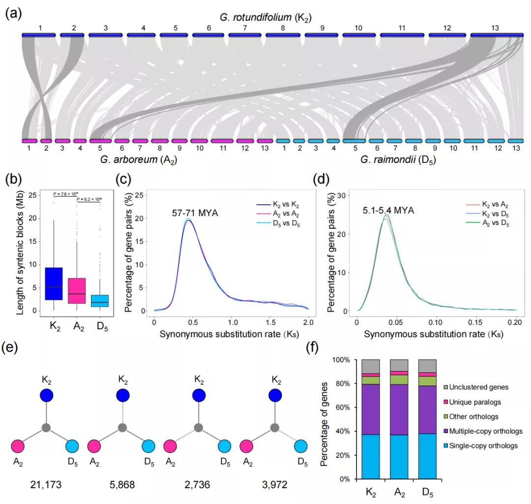 比較基因組分析表明,A2和K2基因組在Chr01與Chr02染色體間存在一個大的易位;K2和D5基因組在Chr13與Chr05染色體間存在一個大的易位。Ks分析與前期研究一致,結(jié)果表明,三個棉種在57-71百萬年前存在一次共同的全基因組復制事件(圖3),并在5.1-5.4 百萬年前發(fā)生物種分化,K2、A2和D5基因組與它們最近的外類群約在8.5-10 百萬年前發(fā)生了分化。由于這三個基因組來自同一祖先,作者探討了物種形成后共線基因丟失和增加的程度。分析表明結(jié)果表明,K2和D5/A2之間的比較顯示 K2缺失基因數(shù)量最多(D5和A2有5868個共線,而K2中沒有).使用OrthoMCL進行的基因家族分析,發(fā)現(xiàn)三個棉中每個基因組大約有15%特異的基因家族。